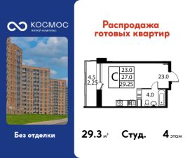 Продаётся студия в сданном доме (Корпус 3), срок сдачи: 2-кв. 2025, общей площадью 29.25 кв.м., на 4 этаже. ЖК ''Космос'' - новое место для жизни, в котором сочетаются отличная экология, удобное расположение, креативные решения архитектуры и функциональные планировки квартир. Строительство жилого комплекса ведётся при проектном финансировании Сбербанка. ЖК ''Космос'' расположен в микрорайоне Авиационный (Домодедово), в 24 километрах от МКАД по Каширскому шоссе.Проект будет состоять из 7 корпусов высотой 12 этажей. На первых этажах домов запланировано открытие необходимых для жителей объектов торговой и социальной инфраструктуры, в том числе магазинов, кафе, медицинского центра. В микрорайоне Авиационный также есть всё необходимое для комфортной жизни - здесь находятся детские сады, школы, высшие учебные заведения, магазины, поликлиники и медицинские центры, спортивный клуб, ТЦ ''Торговый город''. Помимо этого, жители ЖК ''Космос'' смогут пользоваться развитой инфраструктурой г.о. Домодедово - до него можно добраться за 20 минут на автомобиле или электричке.Одна из особенностей ЖК ''Космос'' - отличное экологическое состояние локации. В 10 минутах ходьбы от комплекса находится благоустроенный парк ''Взлёт'' с красивым прудом Лесным, здесь планируется дальнейшее благоустройство территории. Рядом с ''Космосом'', на площади Гагарина, будут проходить городские мероприятия.Проект отличается удобной транспортной доступностью - до МКАД можно добраться за 20-25 минут. Около жилого комплекса находятся остановки общественного транспорта, в пешей доступности - ж/д станция ''Авиационная'' Павелецкого направления.На придомовой территории ЖК ''Космос'' предусмотрено устройство парковочных мест численностью 544 машино-места, в том числе для маломобильных групп населения.