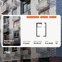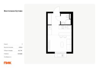 Объект забронирован клиентом!Продаётся квартира-студия площадью 19,8 кв.м на 12 этаже 25 этажного дома (Корпус 41, Секция 3) проекта ПИК Восточное Бутово. Светлый просторный подъезд на уровне земли, функциональная планировка, большие окна, c отделкой. Жилой квартал ''Восточное Бутово'' расположен в 5 км от МКАД по Симферопольскому шоссе, в Ленинском районе Московской области. Это экологически благоприятное место по соседству с Бутовским лесопарком. В 25 минутах на машине - станции метро и МЦД ''Бутово''. В ''Восточном Бутово'' уже открылись пять детских садов из десяти запланированных и одна школа из четырёх. Внутри квартала будет две поликлиники, одна из которых уже работает. В проекте два пешеходных бульвара - по одному из них уже можно гулять и кататься на велосипеде. В закрытых дворах-парках не будет автомобилей - мы построим многоуровневый паркинг, чтобы сделать район ещё более комфортным и безопасным для жителей. Артикул 643624 (Застройщик ООО ''Лотан'')