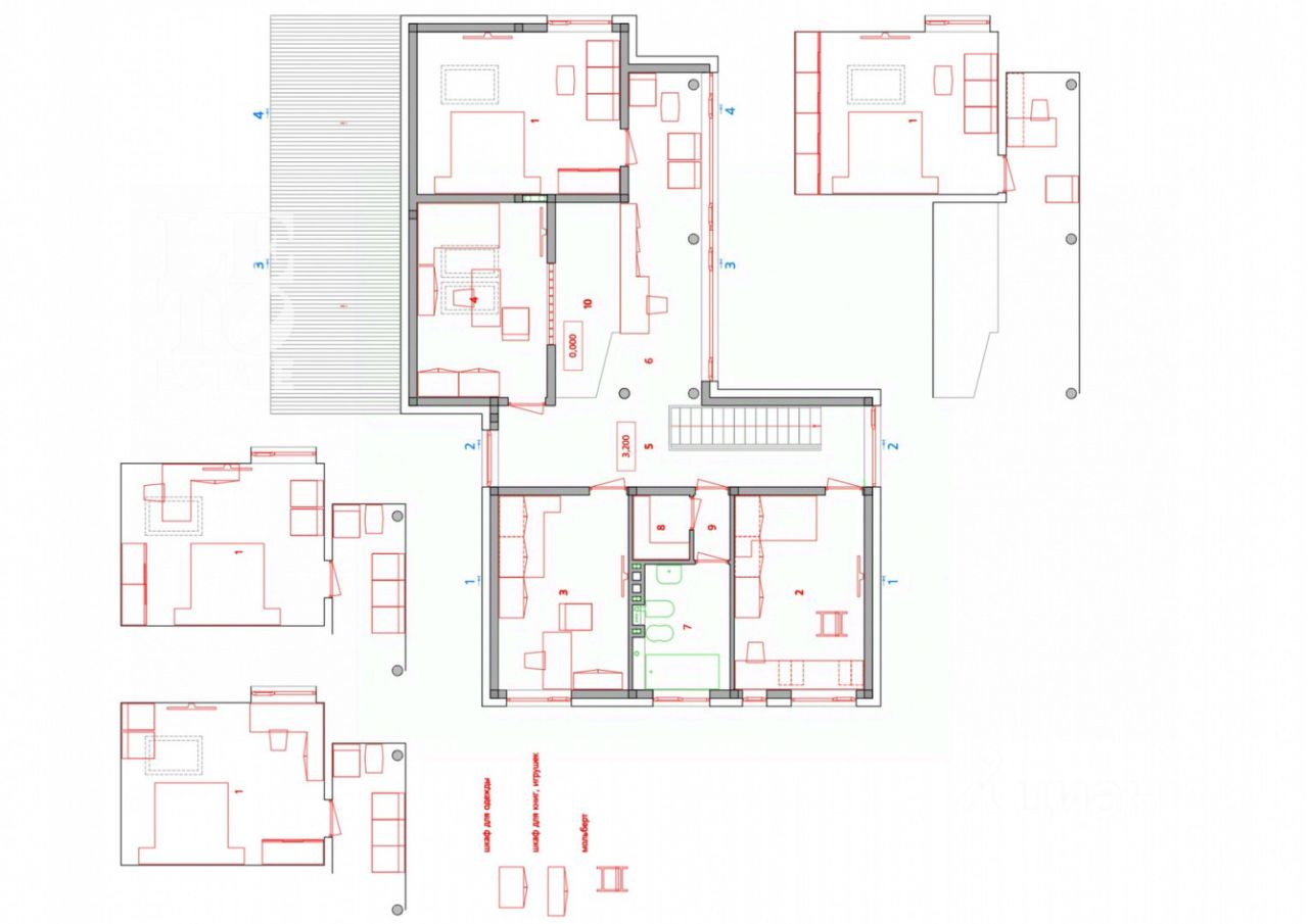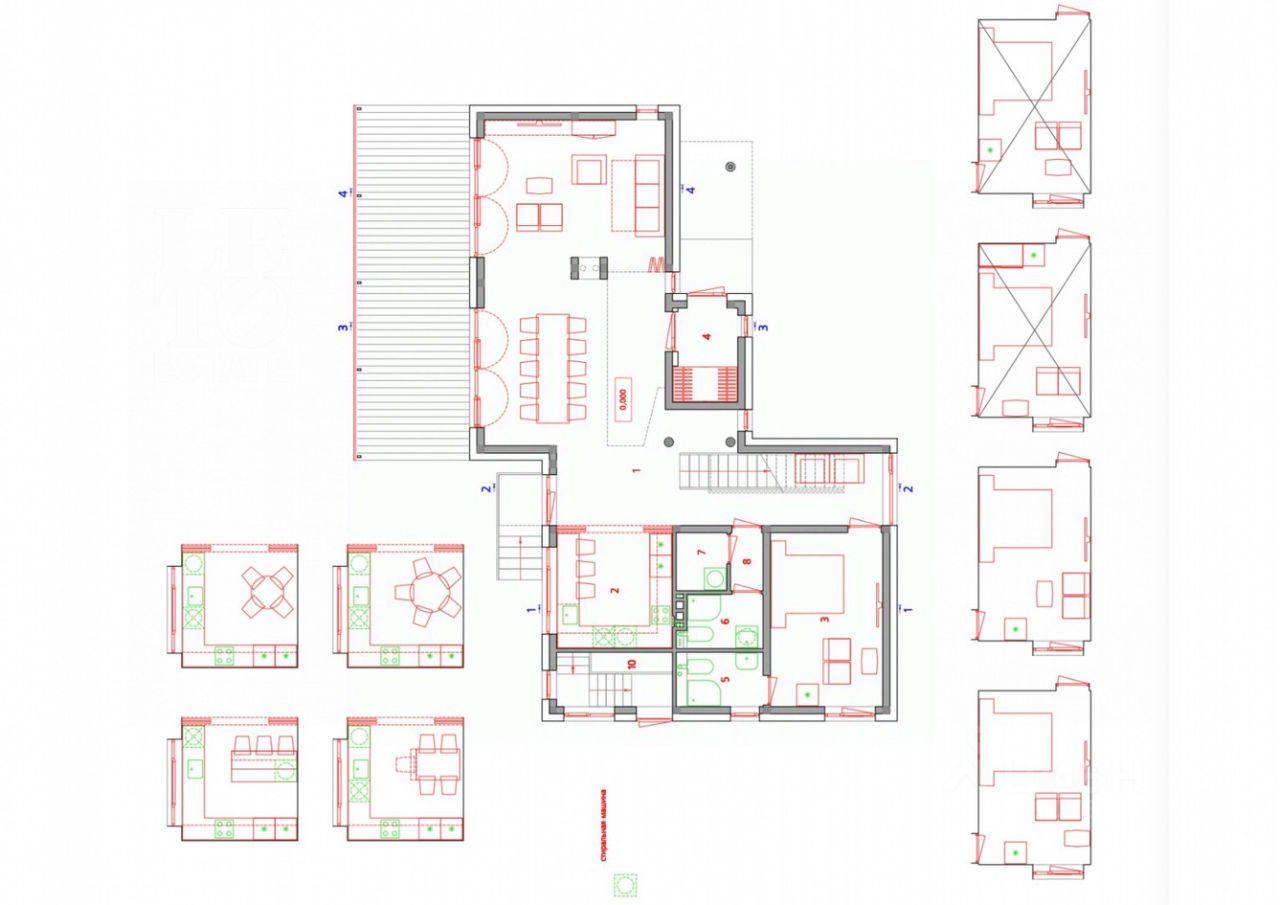Первый этаж: Холл, гостиная, кухня, столовая, санузел, постирочная, спальня со своим санузлом. Второй этаж: четыре спальни, санузел