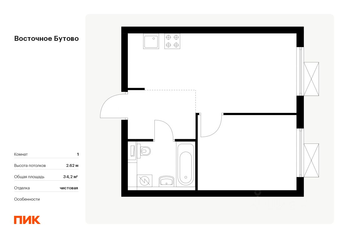 Продаётся 1-комн. квартира площадью 34,2 кв.м на 11 этаже 16 этажного дома (Корпус 41, Секция 1) проекта ПИК Восточное Бутово. Светлый просторный подъезд на уровне земли, функциональная планировка, большие окна, .