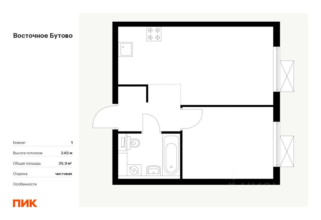 Продаётся 1-комн. квартира площадью 35,9 кв.м на 10 этаже 25 этажного дома (Корпус 42, Секция 4) проекта ПИК Восточное Бутово. Светлый просторный подъезд на уровне земли, функциональная планировка, большие окна, .