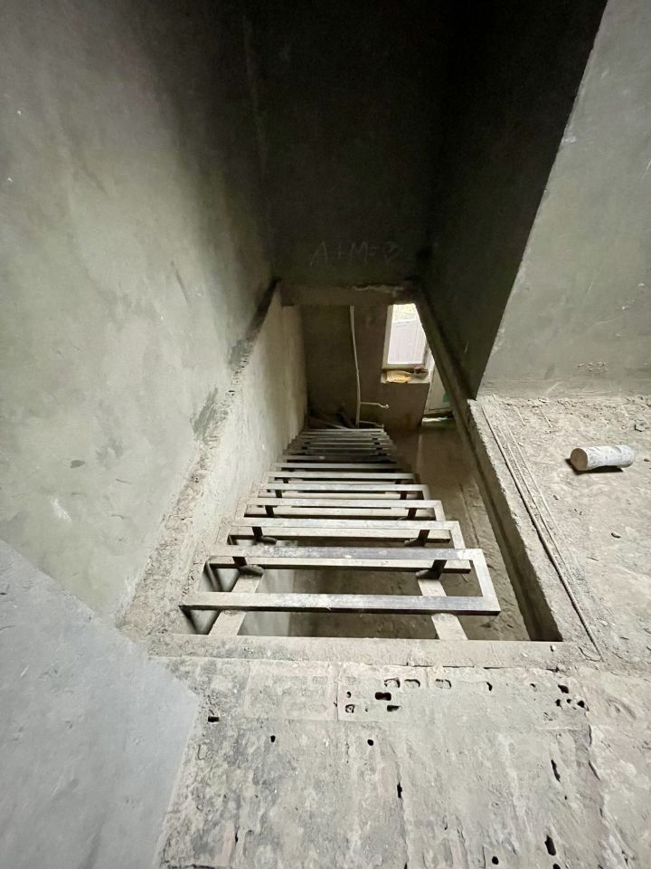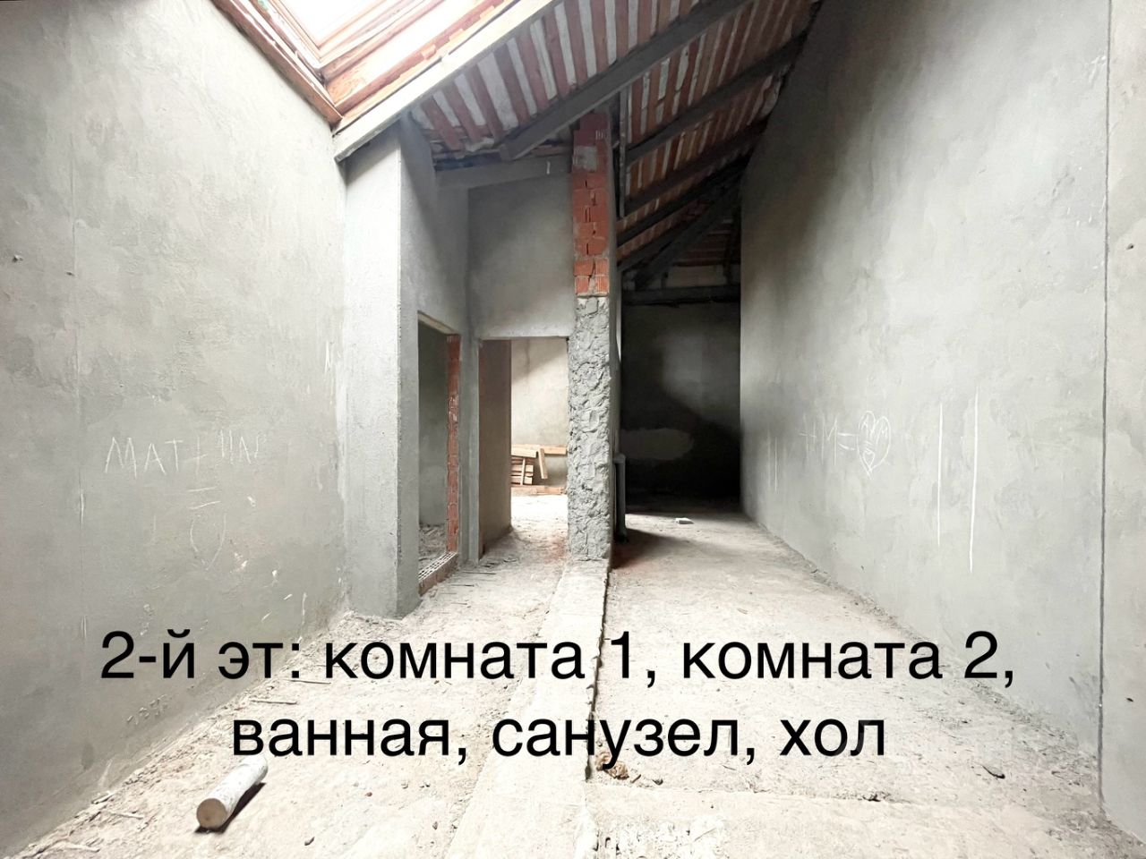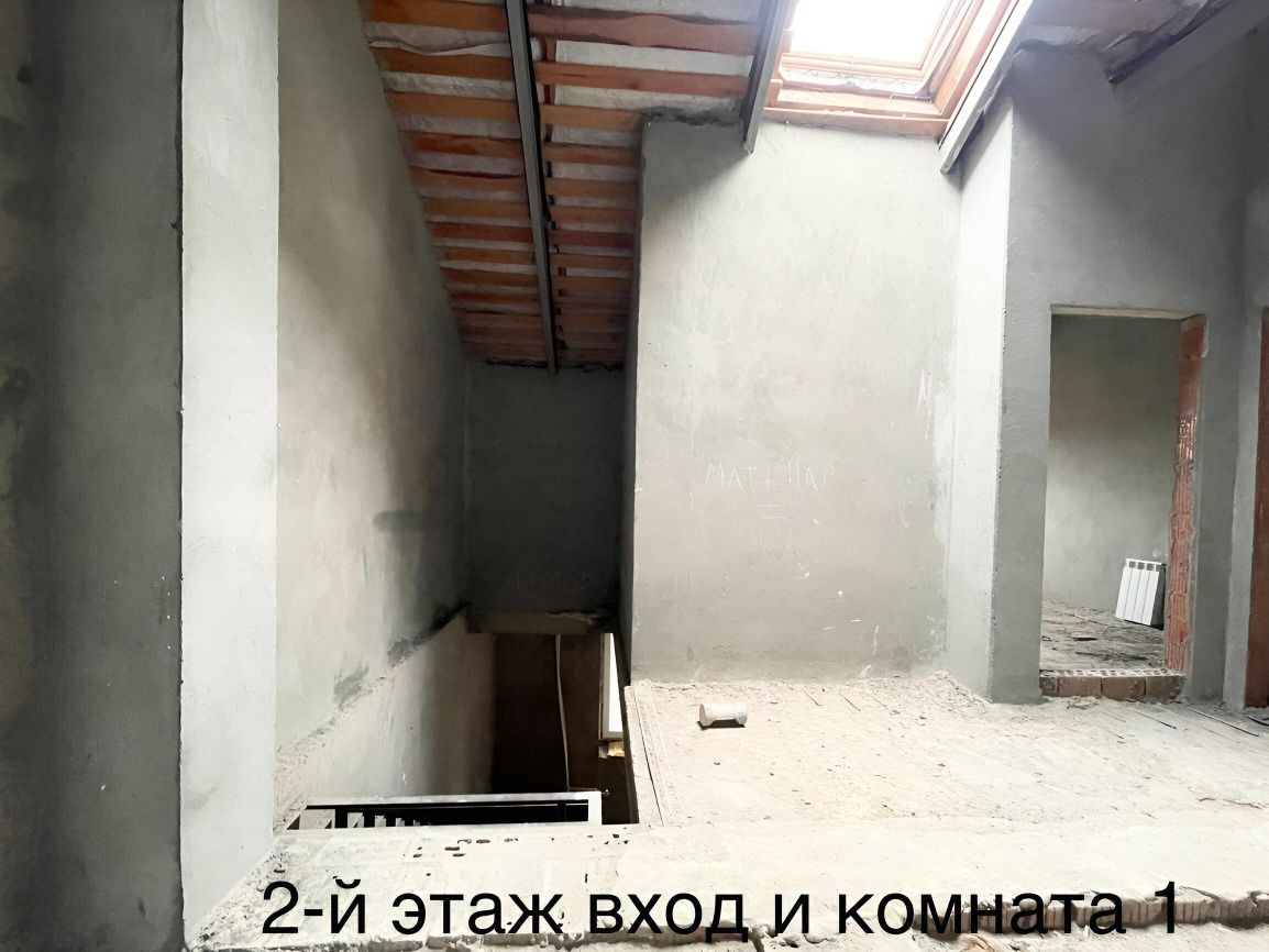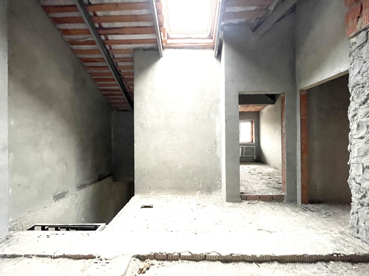 Железная лестница на второй этаж залита стяжка на первом и втором уровне, оштукатурены стены.