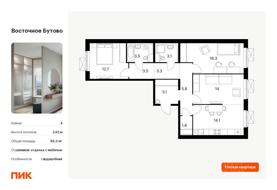 Продаётся 3-комн. квартира площадью 83,3 кв.м на 13 этаже 16 этажного дома (Корпус 17, Секция 2) проекта ПИК Восточное Бутово. Светлый просторный подъезд на уровне земли, функциональная планировка, большие окна, c отделкой.