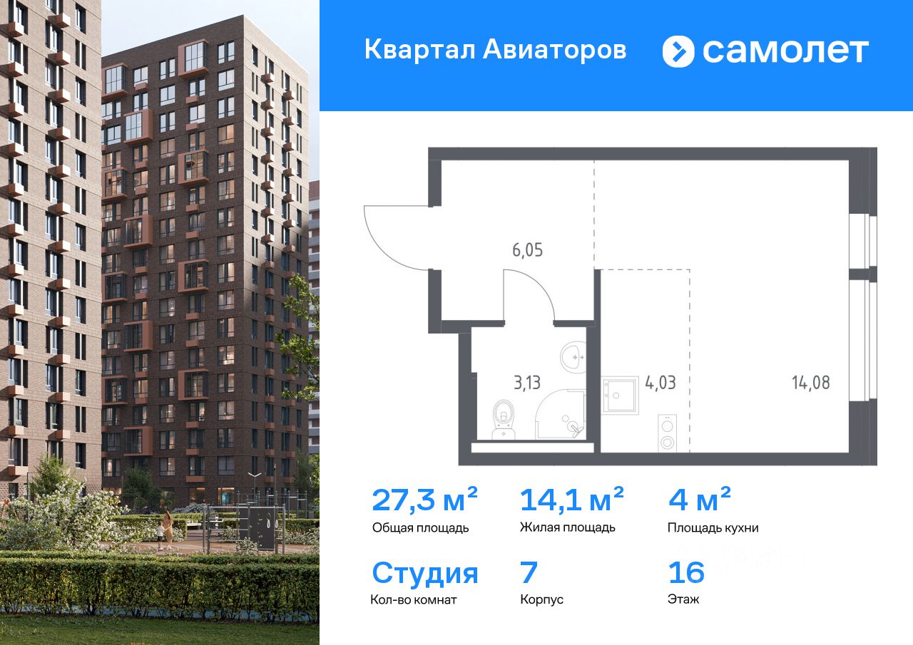 Строим кварталы для жизни с заботой о будущем. Предлагается квартира студия комфорт-класса 27,29 кв.м в корпусе 7 на 16 этаже, в ЖК ''Квартал Авиаторов'' Квартира с чистовой отделкой. Доступность дополнительных опций уточняйте у застройщика.