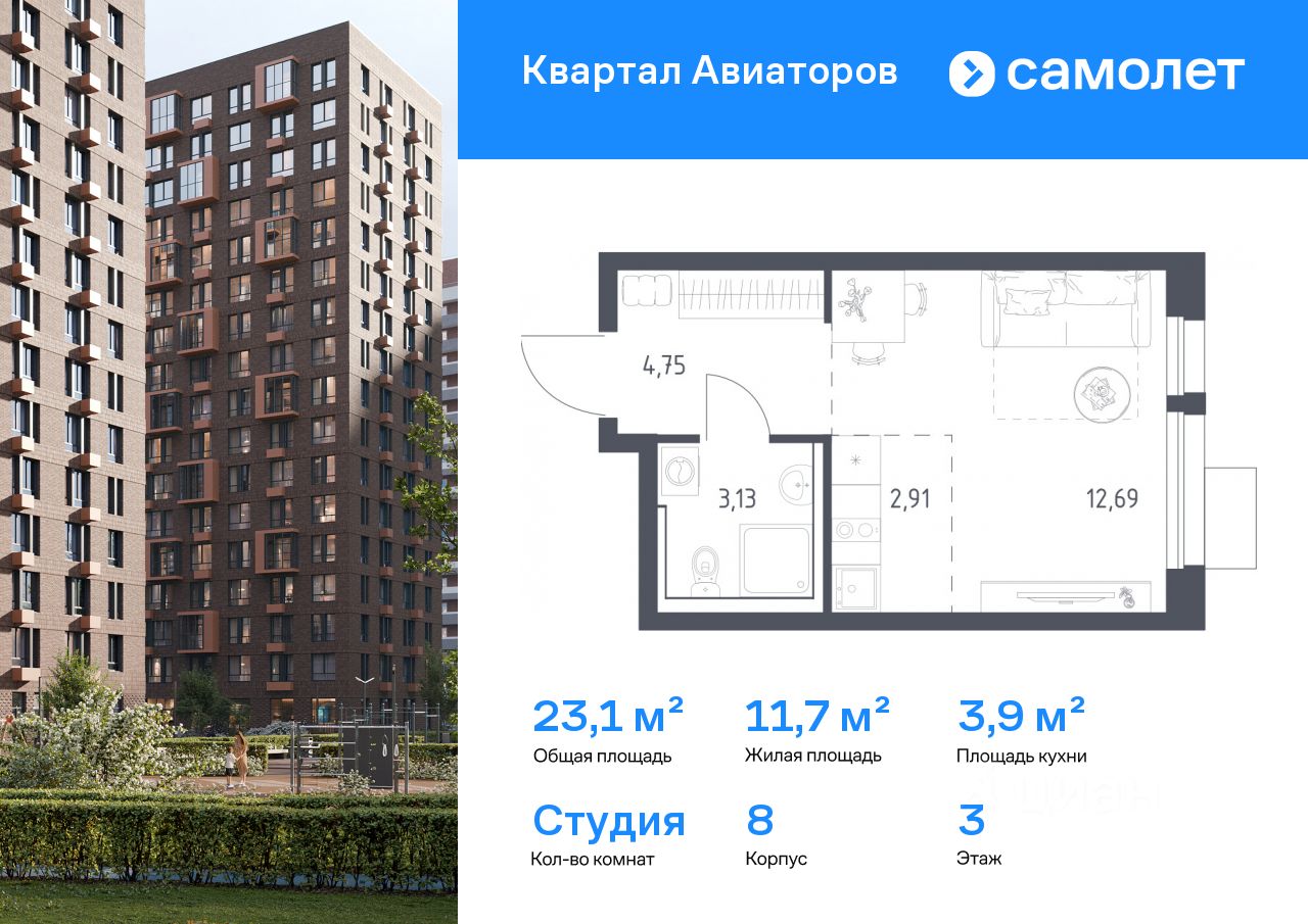 Предлагается квартира студия комфорт-класса 23,1 кв.м в корпусе 8 на 3 этаже, в ЖК ''Квартал Авиаторов''
