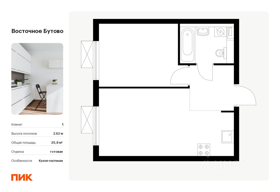 Продаётся 1-комн. квартира площадью 35,8 кв.м на 11 этаже 25 этажного дома (Корпус 41, Секция 3) проекта ПИК Восточное Бутово. Светлый просторный подъезд на уровне земли, функциональная планировка, большие окна, .