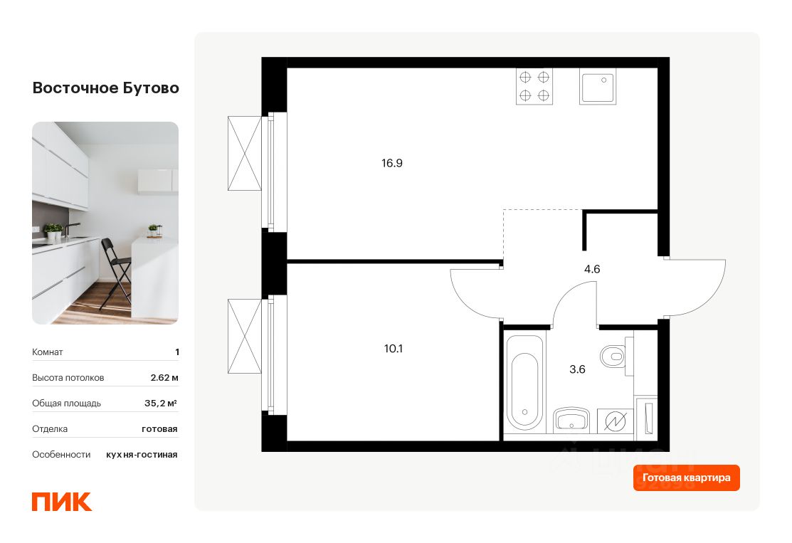 Продаётся 1-комн. квартира площадью 35,2 кв.м на 13 этаже 16 этажного дома (Корпус 18, Секция 3) проекта ПИК Восточное Бутово. Светлый просторный подъезд на уровне земли, функциональная планировка, большие окна, c отделкой.