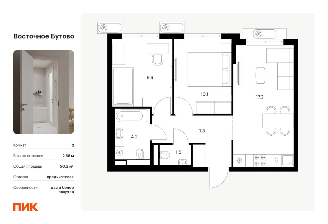 Продаётся 2-комн. квартира площадью 50,2 кв.м на 10 этаже 25 этажного дома (Корпус 47, Секция 3) проекта ПИК Восточное Бутово. Светлый просторный подъезд на уровне земли, функциональная планировка, большие окна, предчистовая отделка.