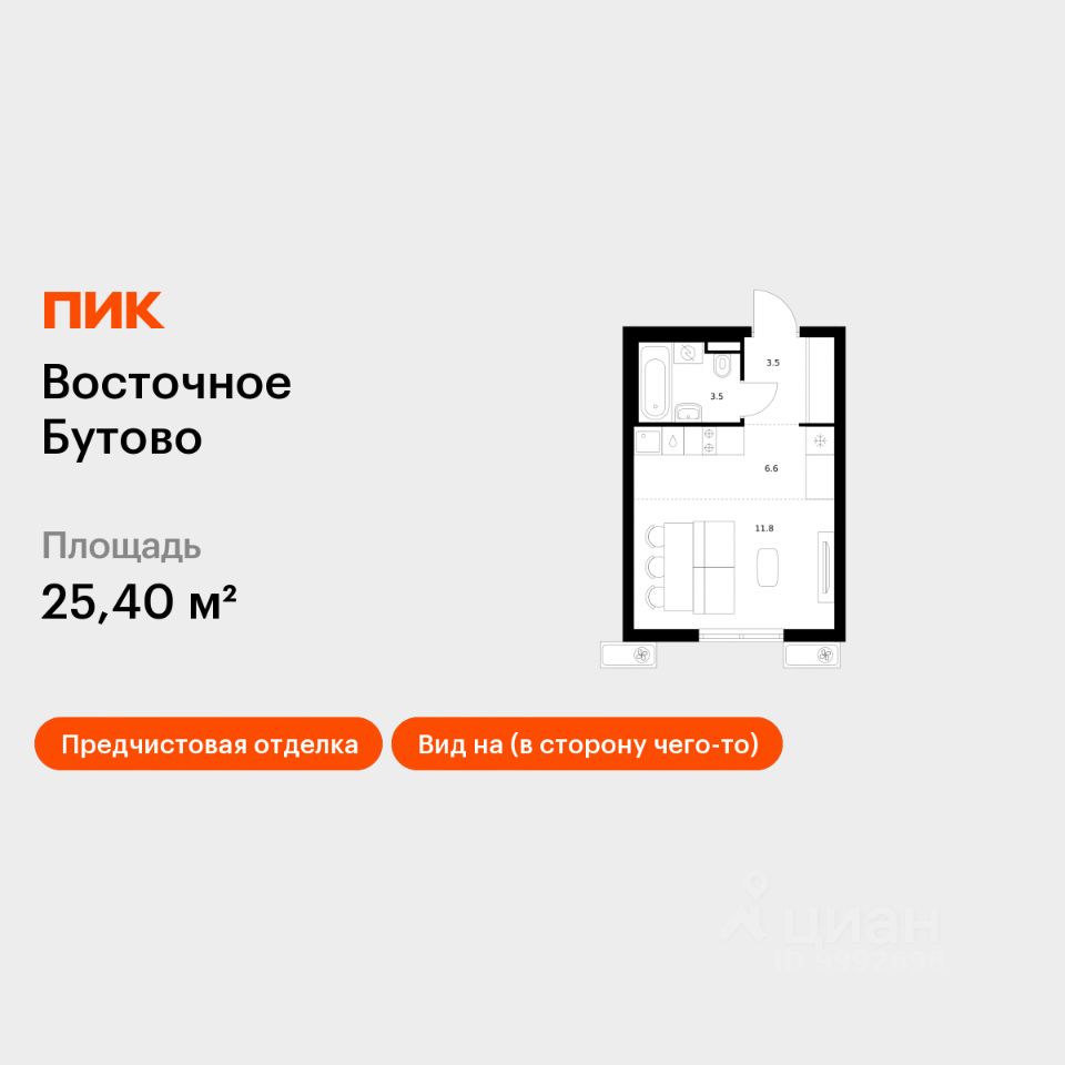 Продаётся квартира-студия площадью 25,4 кв.м на 18 этаже 25 этажного дома (Корпус 47, Секция 3) проекта ПИК Восточное Бутово. Светлый просторный подъезд на уровне земли, функциональная планировка, большие окна, предчистовая отделка.