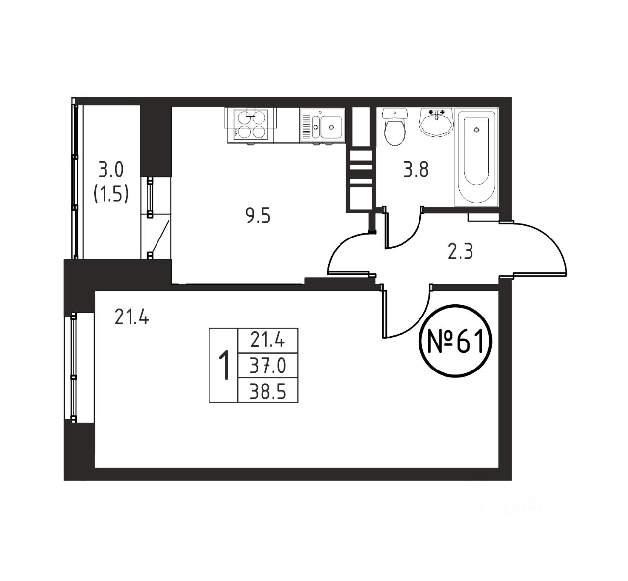Общая площадь38,5 м2