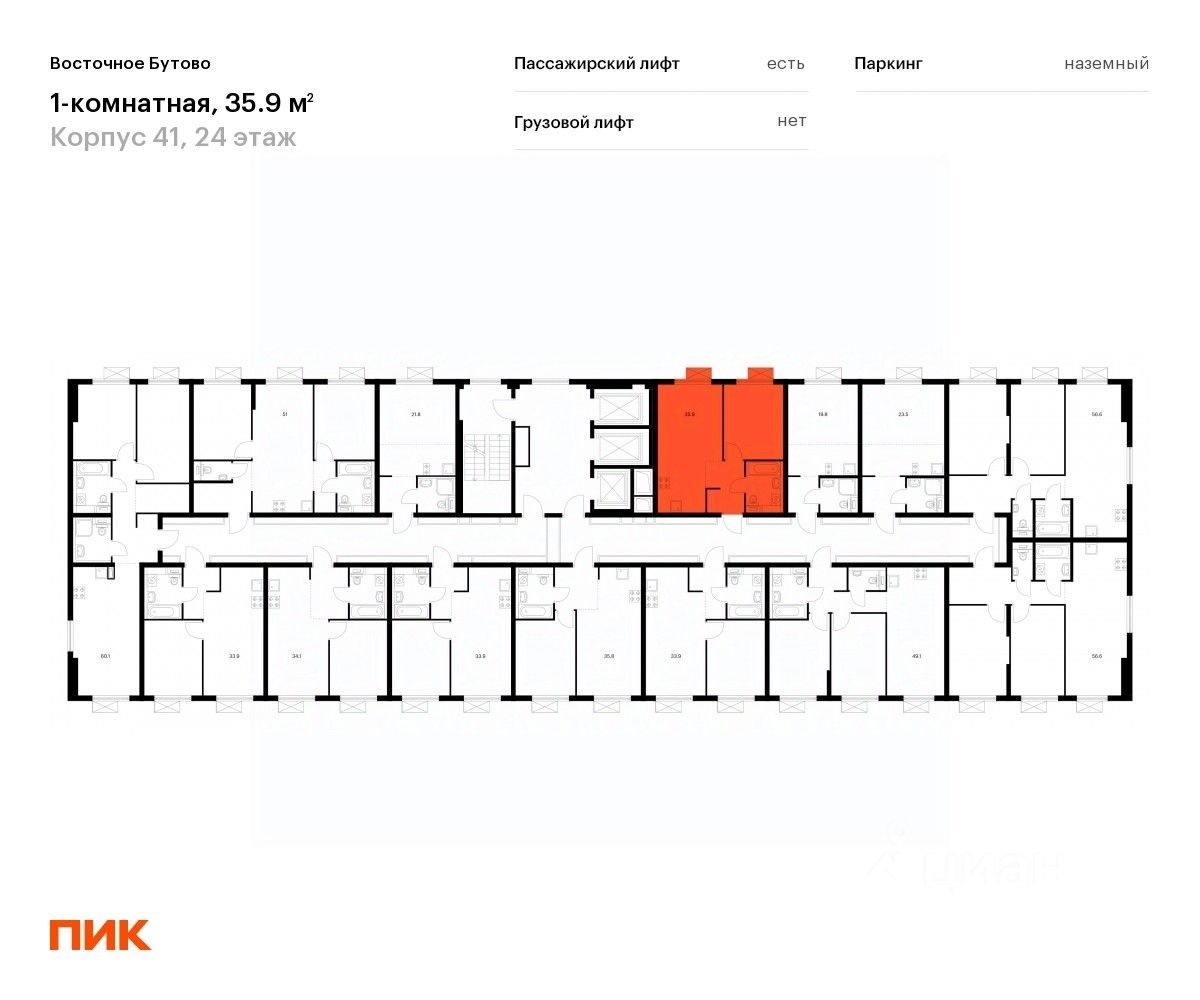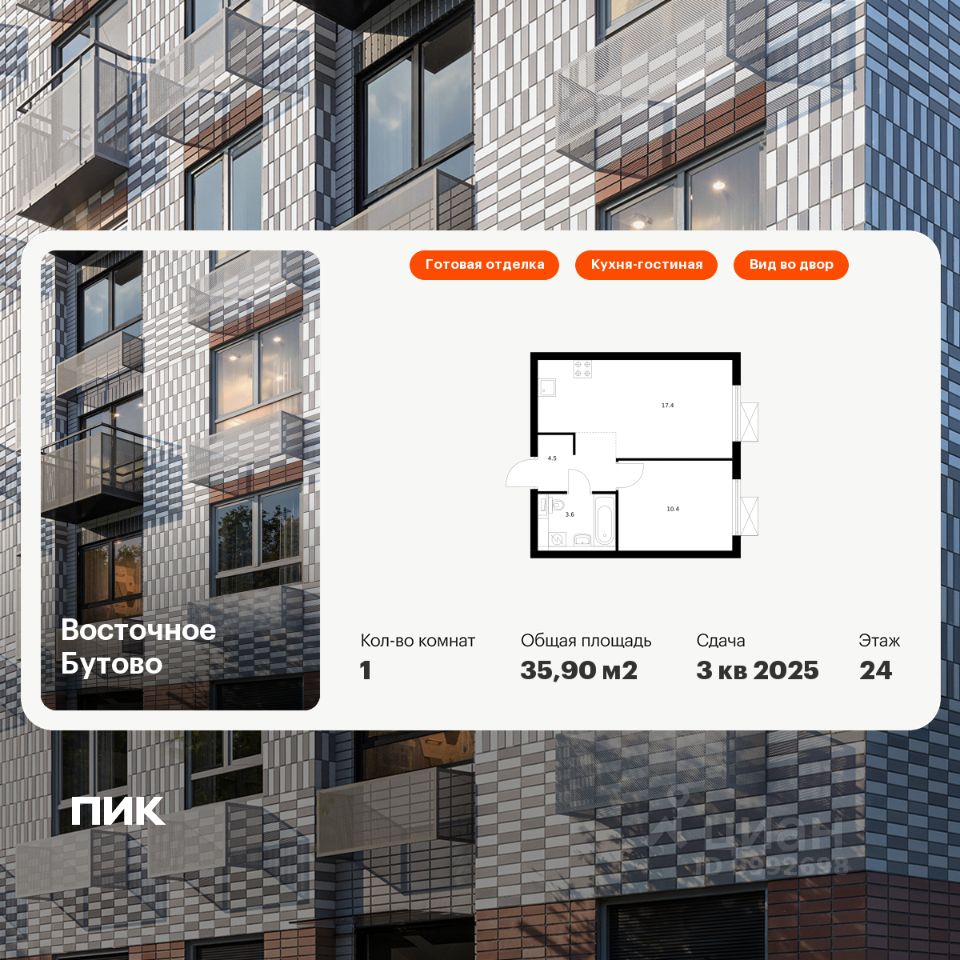 Продаётся 1-комн. квартира площадью 35,9 кв.м на 24 этаже 25 этажного дома (Корпус 41, Секция 3) проекта ПИК Восточное Бутово. Светлый просторный подъезд на уровне земли, функциональная планировка, большие окна, c отделкой.