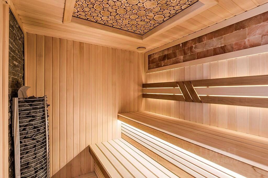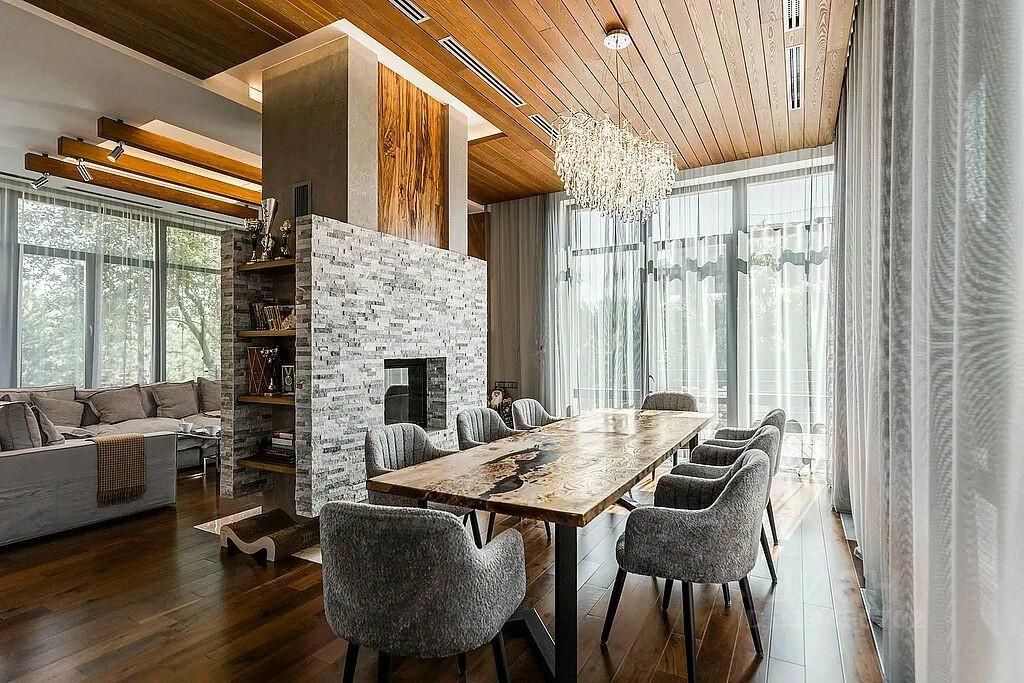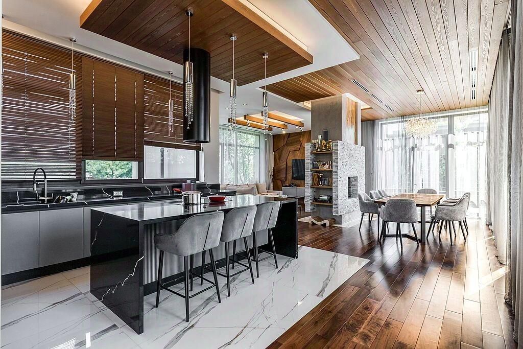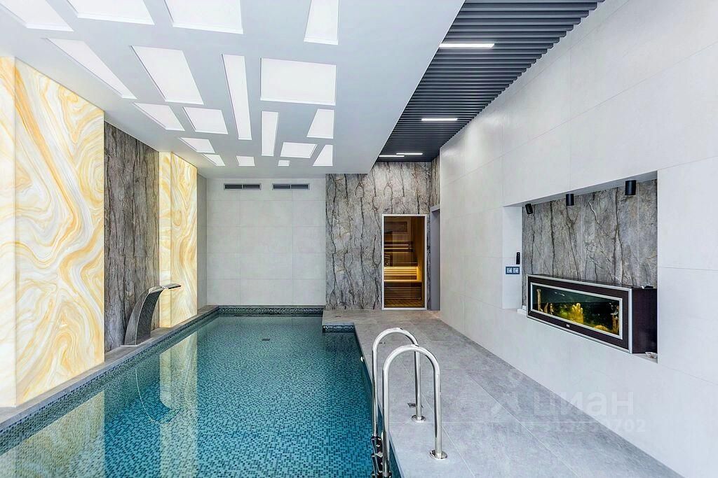 На первом этаже находятся кухня-гостиная с двусторонним камином и панорамными окнами, бассейн с противотоком длиной 7 метров, сауна, открытая терраса, два санузла и гардеробная, технические помещения (постирочная, котельная), а также гараж на две машины