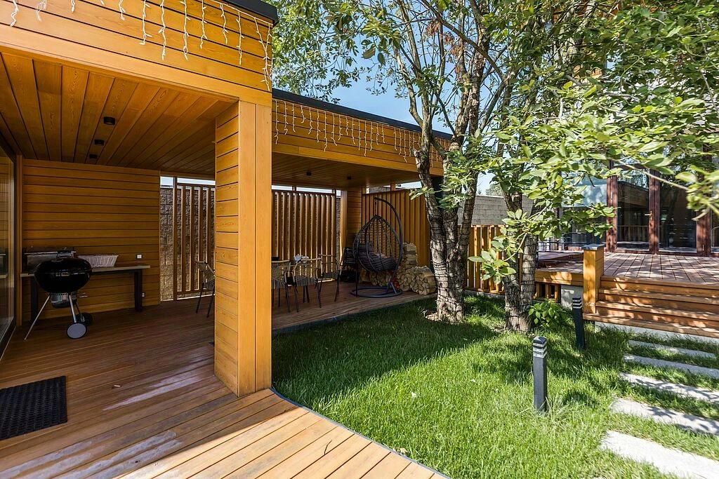 На участке площадью 15 соток выполнен ландшафтный дизайн, включающий сосны, ели, канадские клёны, каштаны и другие растения. Также на территории есть реликтовый лес и река Банька, создающие атмосферу уюта и спокойствия