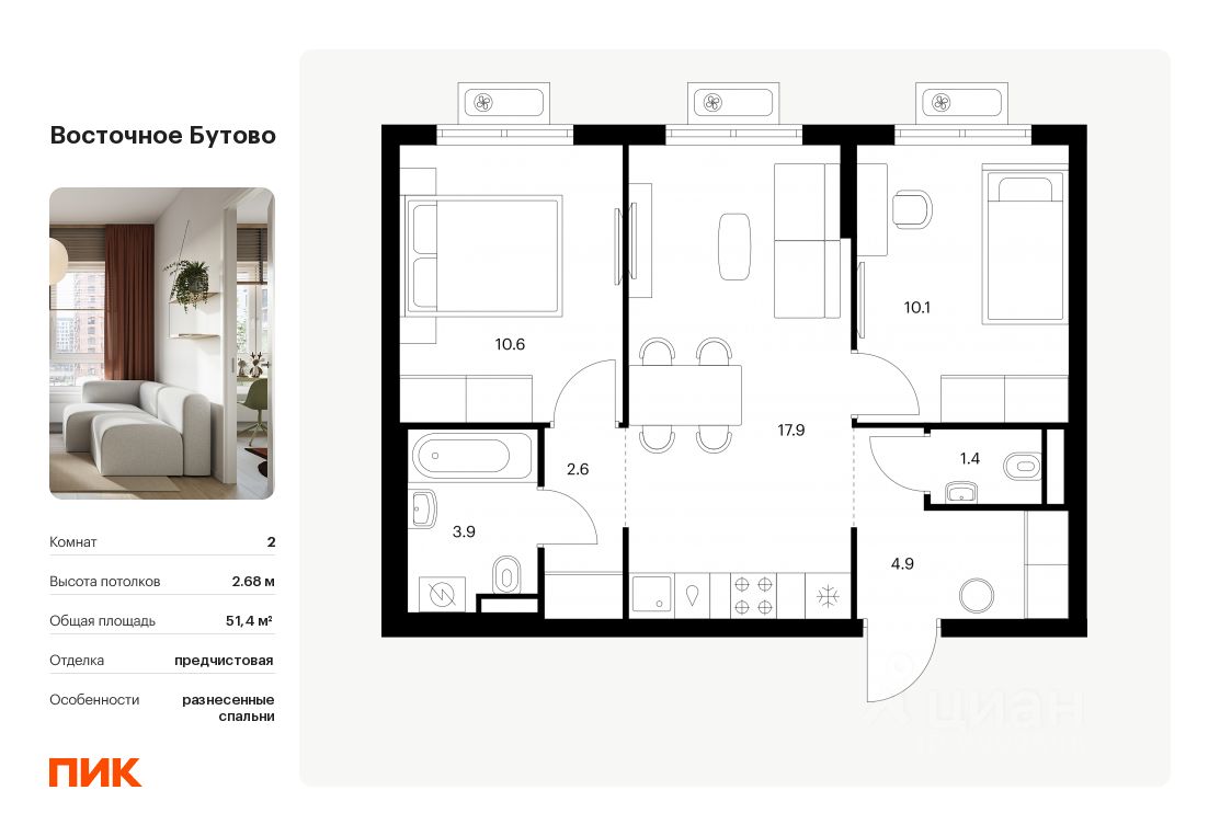 Общая площадь51,4 м2