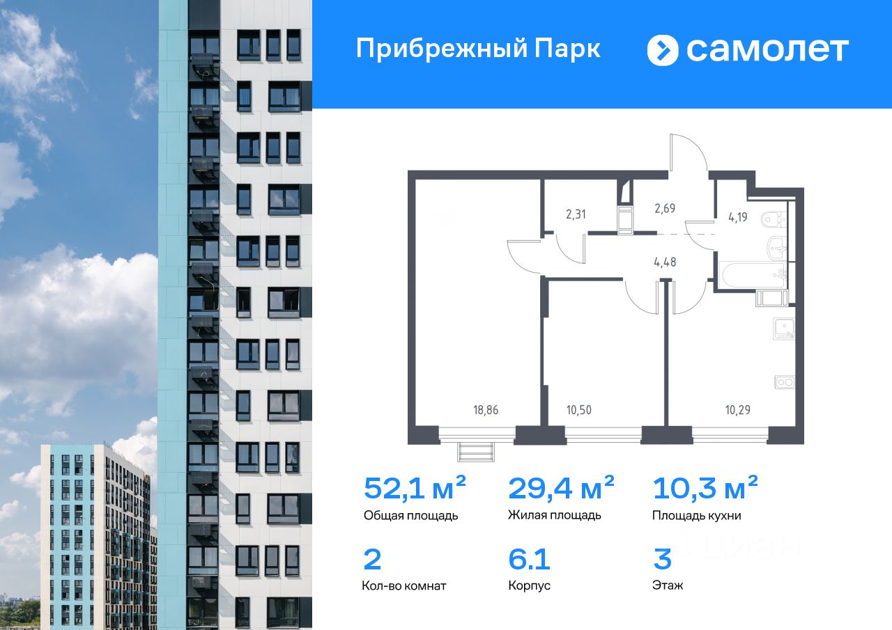 Предлагается 2-комнатная квартира комфорт-класса 52,1 кв.м в корпусе 6.1 на 3 этаже, в ЖК ''Прибрежный Парк'' Квартира с чистовой отделкой. Доступность дополнительных опций уточняйте у застройщика.
