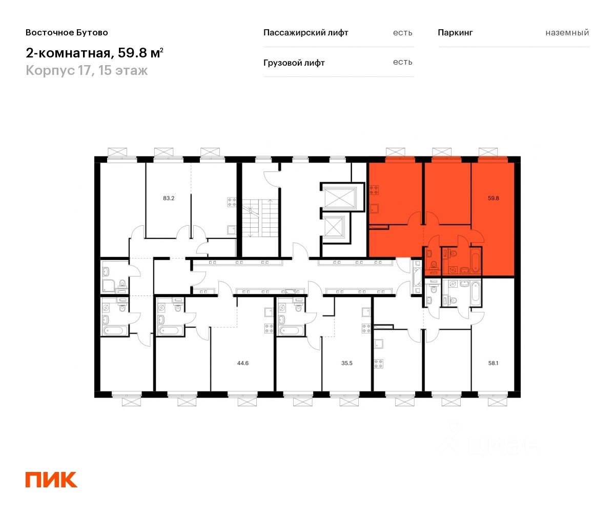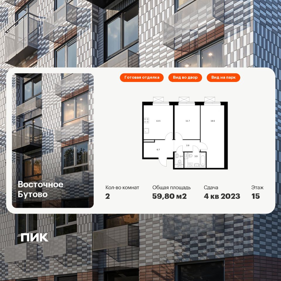 Продаётся 2-комн. квартира площадью 59,8 кв.м на 15 этаже 16 этажного дома (Корпус 17, Секция 2) проекта ПИК Восточное Бутово. Светлый просторный подъезд на уровне земли, функциональная планировка, большие окна, c отделкой.