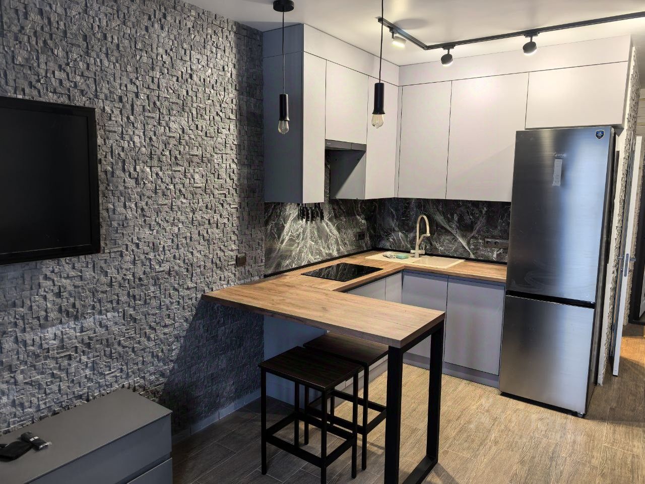 Квартира оформлена в дизайнерском стиле. В комнате и на кухне есть необходимая мебель. Для вашего удобства установлена современная техника: кондиционер, холодильник, посудомоечная и стиральная машины, телевизор. В санузле есть душевая кабина, что удобно для ежедневного использования. Окна выходят на улицу, а также имеется лоджия для отдыха на свежем воздухе.