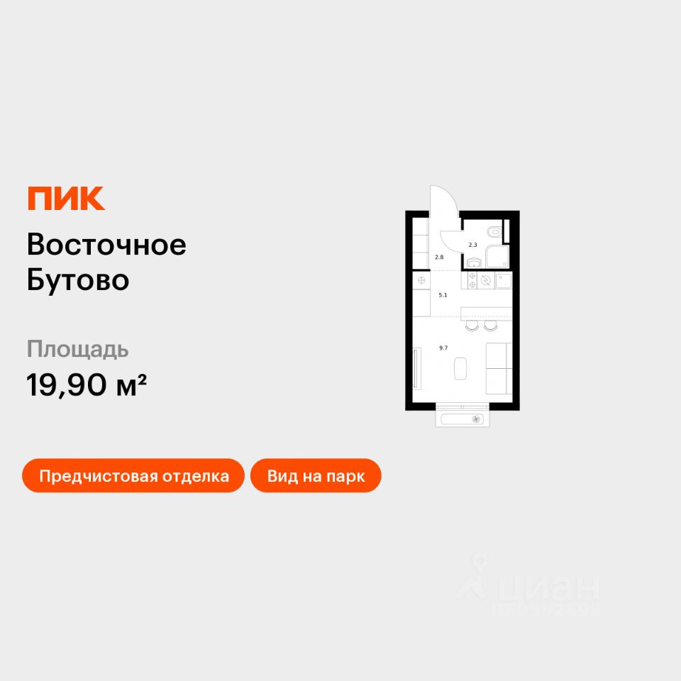 Продаётся квартира-студия площадью 19,9 кв.м на 5 этаже 17 этажного дома (Корпус 48, Секция 2) проекта ПИК Восточное Бутово. Светлый просторный подъезд на уровне земли, функциональная планировка, большие окна, предчистовая отделка.